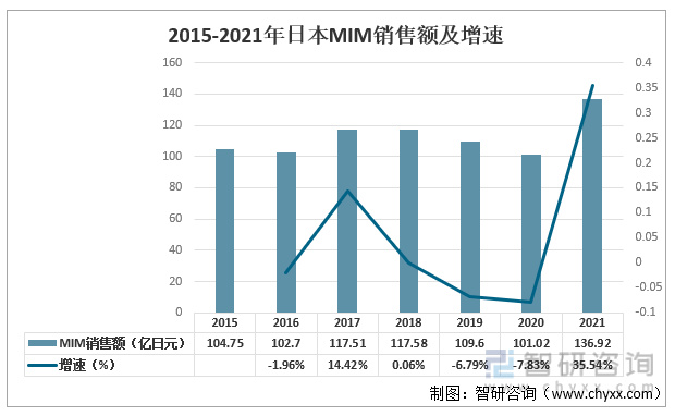 金属注射成形的简称。MIM是一种将金属粉末与其粘结剂的混合料注射于模型中的成形方法。它是先将所选粉末与粘结剂进行混合,然后将混合料进行再注射成形所需要的形状。据统计,2021年MIM的销售额为136.9亿日元。同比上年增加了35.54%。这是各领域需求回升造成的,尤其是半导体制造设备需求的强劲增长是影响其发展的重要因素。